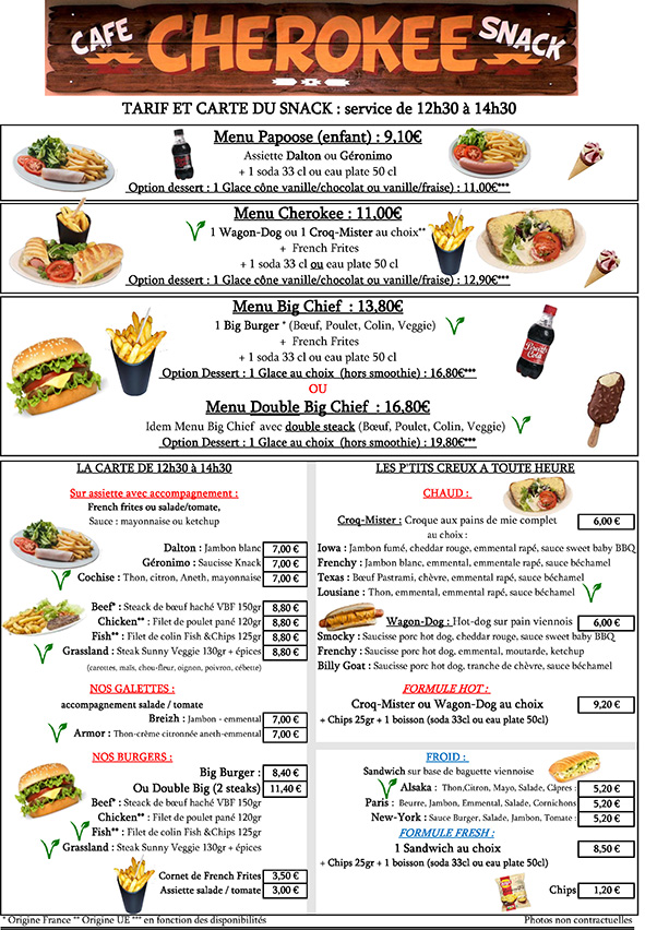 The menu you book in the All Inclusive Formula is the Cherokee Menu with the dessert offered (If you choose the Papoose menu, the dessert is already included), you can complete on site to access the Big Chief menu (with an extra) or order a la carte (be careful, if you order a la carte, you won’t have the free dessert).