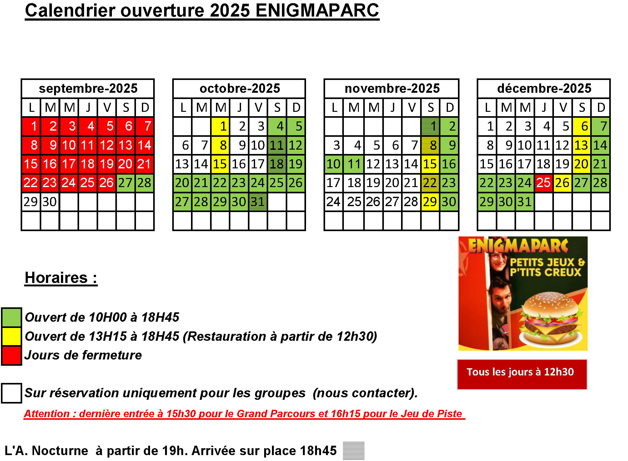 Le parc est ouvert toute l’année, les weekends, jours fériés (en dehors du 25 décembre et 1er janvier) et tous les jours des vacances scolaires de la zone B ; auxquels s’ajoutent certains « mercredi » des autres zones de vacances. A noter 2 périodes de fermeture annuelle : le mois de JANVIER (pour partie : car nous mettons en place les nouveaux jeux et énigmes de l’année suivante) et le mois de Septembre pendant lequel le décorateur profite pour rénover les décors et l’équipe d’accueil prend ses vacances.