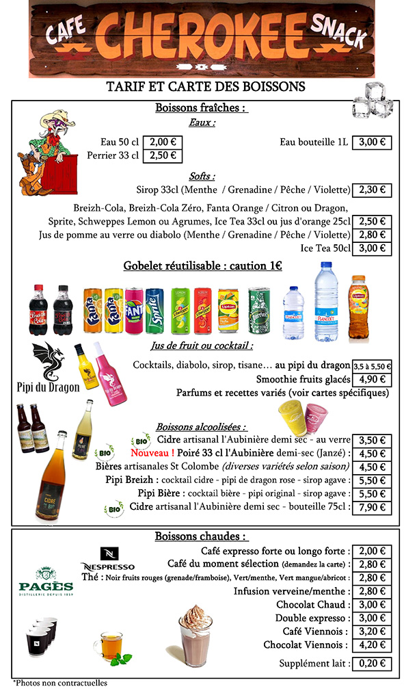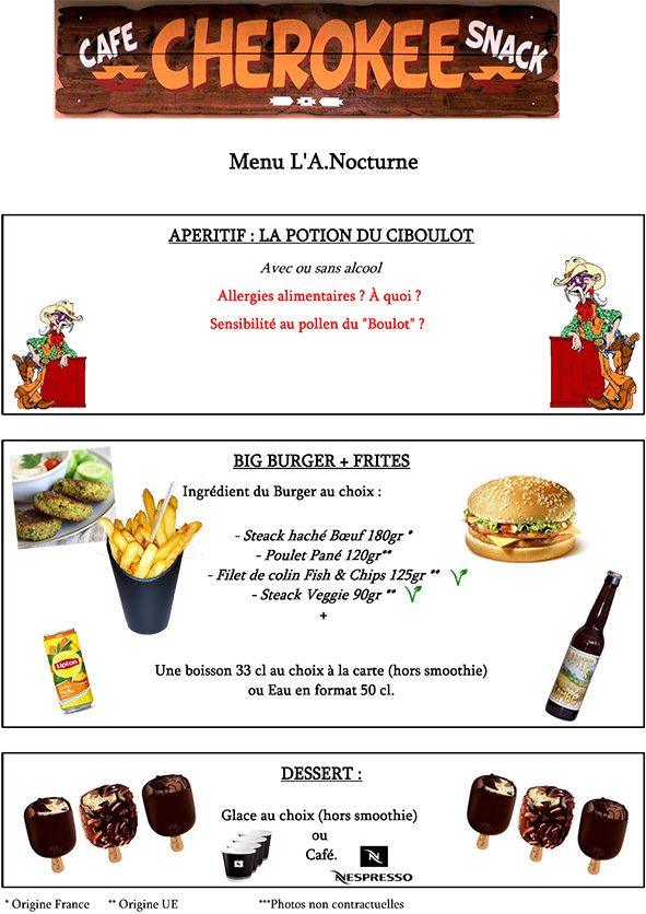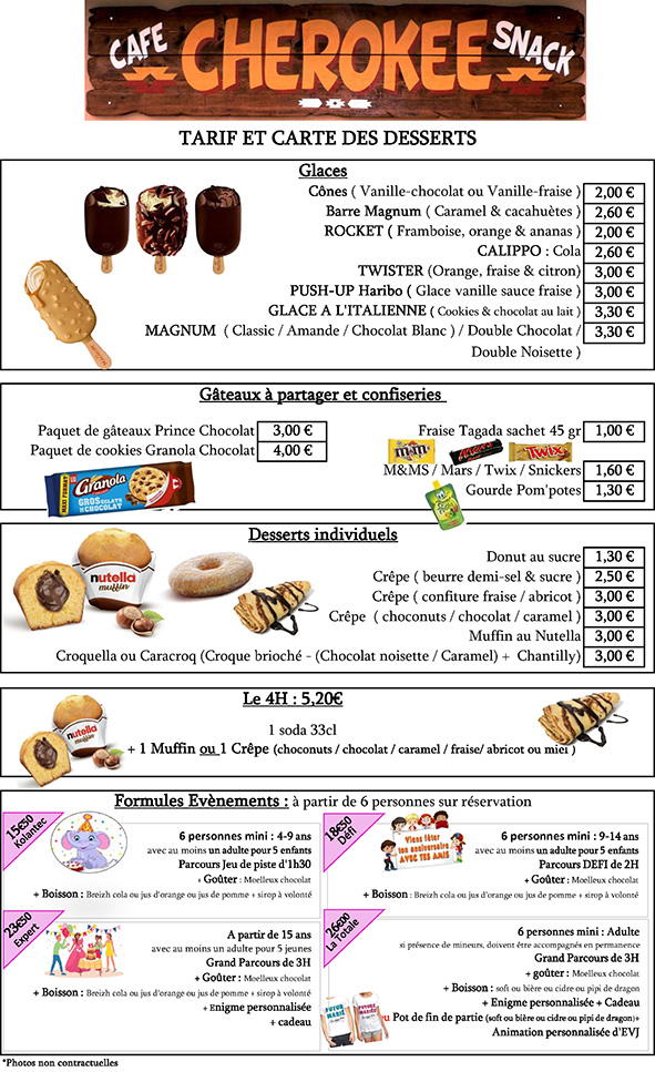 Le menu que vous réservez sur internet est le cherokee avec dessert offert (si vous choisissez le menu papoose ; le dessert est déjà compris) ; vous pourrez compléter sur place pour accéder au menu Big Chief avec toujours le dessert offert (en payant un complément de 2.40€) . Attention, en commandant à la carte vous perdez l’avantage du dessert offert.